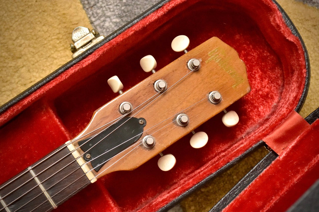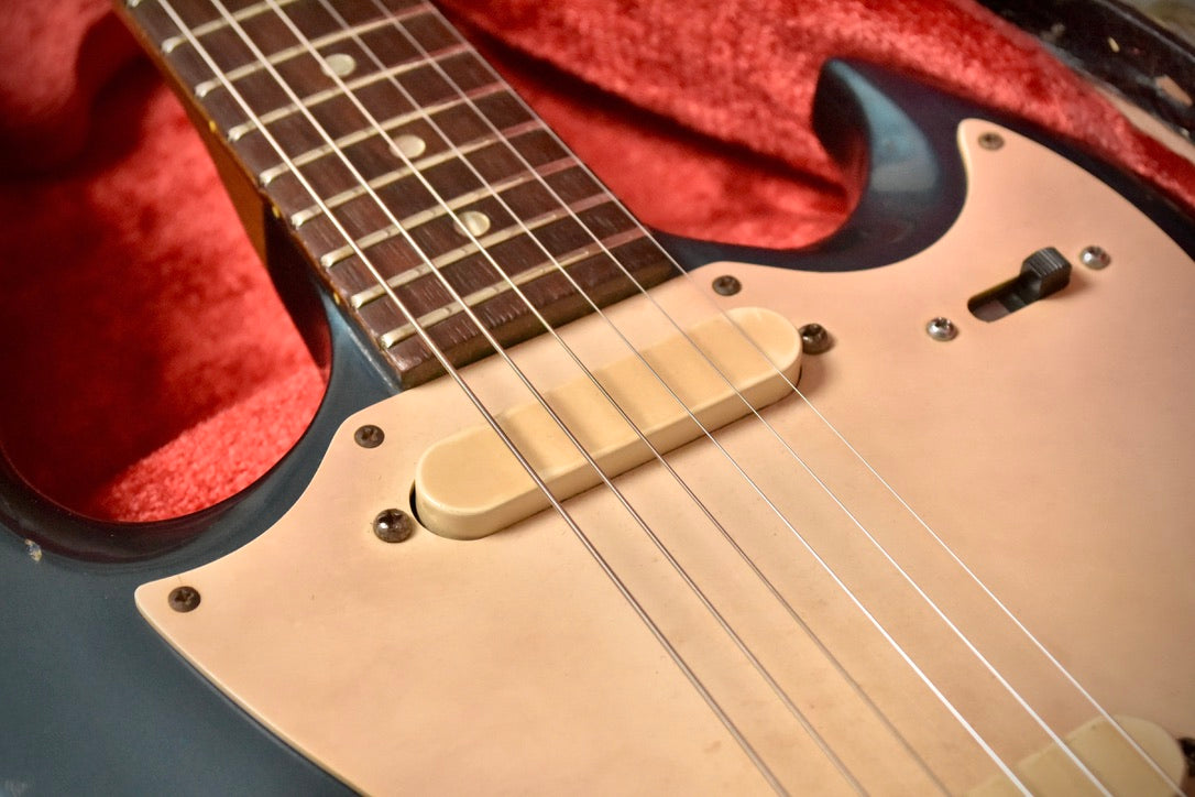 The factory Vibrola arm not only looks cool, but stays in tune well too. A duo of Gibson single coil pickups have good output and showcases the open tone the Melody Maker offers. The original CTS pots date to 1966. The original frets are getting low and show some pitting, however the guitar plays cleanly across the neck and intonates correctly.